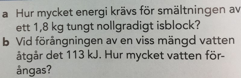 Jag har nyss börjat med värmekapacitet men jag har fastnat på a). Jag vet att jag ska använda mig utav formeln Q=ls*m där ls=4,19*10³*(t1-0) men det står i uppgiften att den är nollgradig, jag vet inte hur jag då ska göra med formeln?