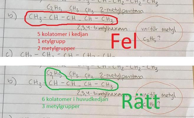Under 11.28 b) så verkar det som att alla tre grupperna till kolkedjan heter metyl (trimetylhexan heter den ju) men jag trodde att den som heter C2H5 skulle heta etyl eftersom den har två kolatomer?