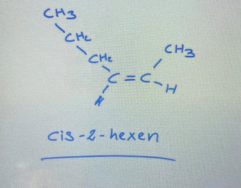 Det finns faktiskt ingen metylgrupp (-CH3) i cis-2-hexen. Det är ett kolväte med sex kol (hex-) med en dubbelbindning vid kol 2 (-en, ändelsen).