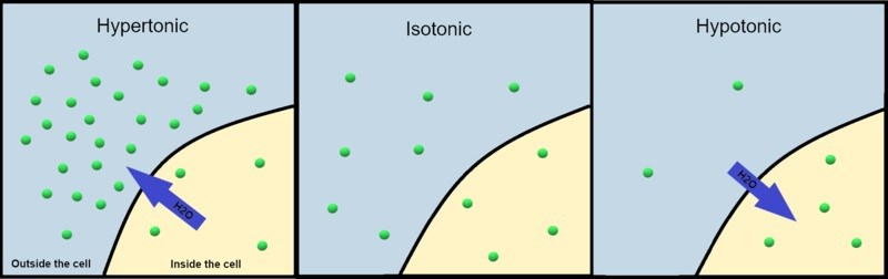 Vad är skillnaden mellan hypertonisk och hypotonisk? En hypertonisk är väl när konc är högre inne i cellen än utanför, går då vattnet in eller ut? är det detta med vattnets osmos att det alltid går från högre konc till en plats med lägre?