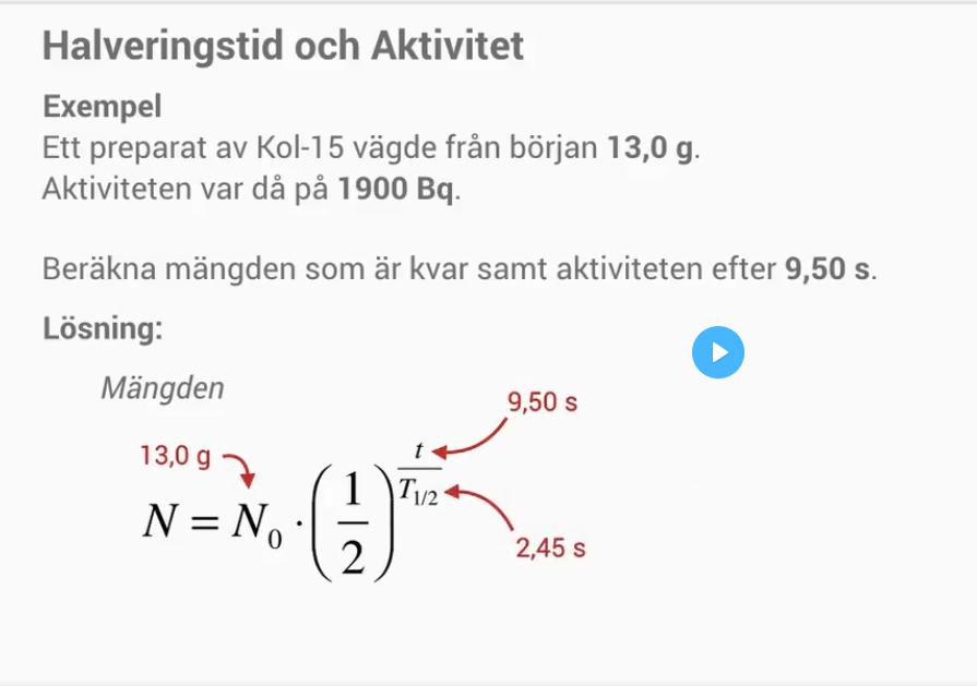 Smaragdalena skrev:Aktiviteten är hur många atomer som sönderfaller varje sekund, d v s aktiviteten är föränfringen av substansmängden. Mer matematiskt kan man säga att aktiviteten är derivatan av substansmängden.