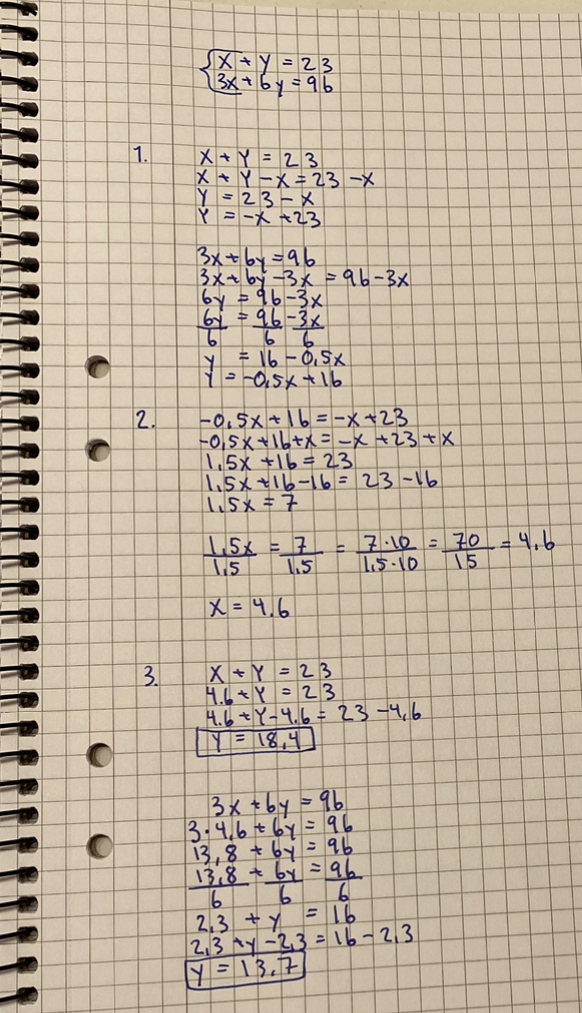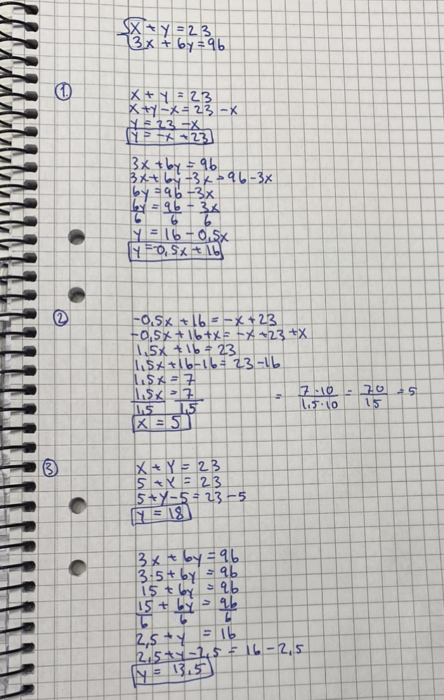 Går igenom olika blandade uppgifter för att öva på min matte. Ibland löser jag ”liknande” uppgifter bra och ibland inte. Den här uppgiften gör mig förvirrad på de viset att jag får ju ut 2 olika y värden (steg 3, se nedan) de säger mig att jag gjort fel någonstans. Liksom jag testa med att ta in mitt x värde i båda ekvationerna för att se om y värdet jag får ut blir samma men de blir ju olika. De ska ju bli samma?