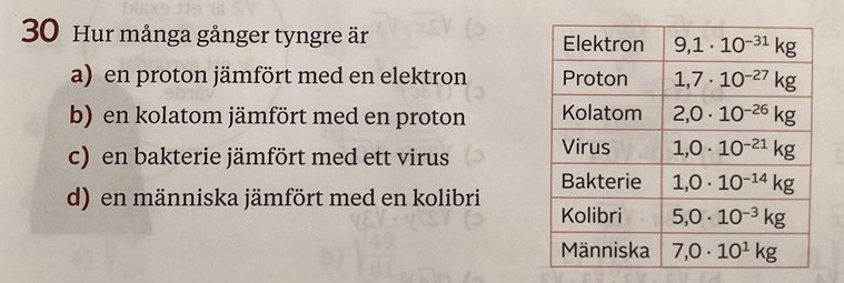 Jag fattar inte hur jag ska räkna ut svaret. Jag tog elektronens vikt delat med protonens vikt, men det funkade inte. Men om det är så man ska göra så kanske jag räknade fel.