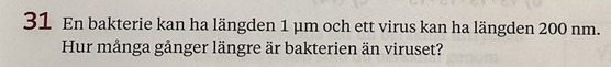 Jag skrev 1 mikrometer i potensform, samt 200 nanometer. Sen vet jag inte hur jag ska fortsätta. I facit står det 5 gånger längre. Jag började med att ta 1 mikrometer i potensform dividerat med 200 nanometer i potensform men fattar inte hur jag ska göra sen.