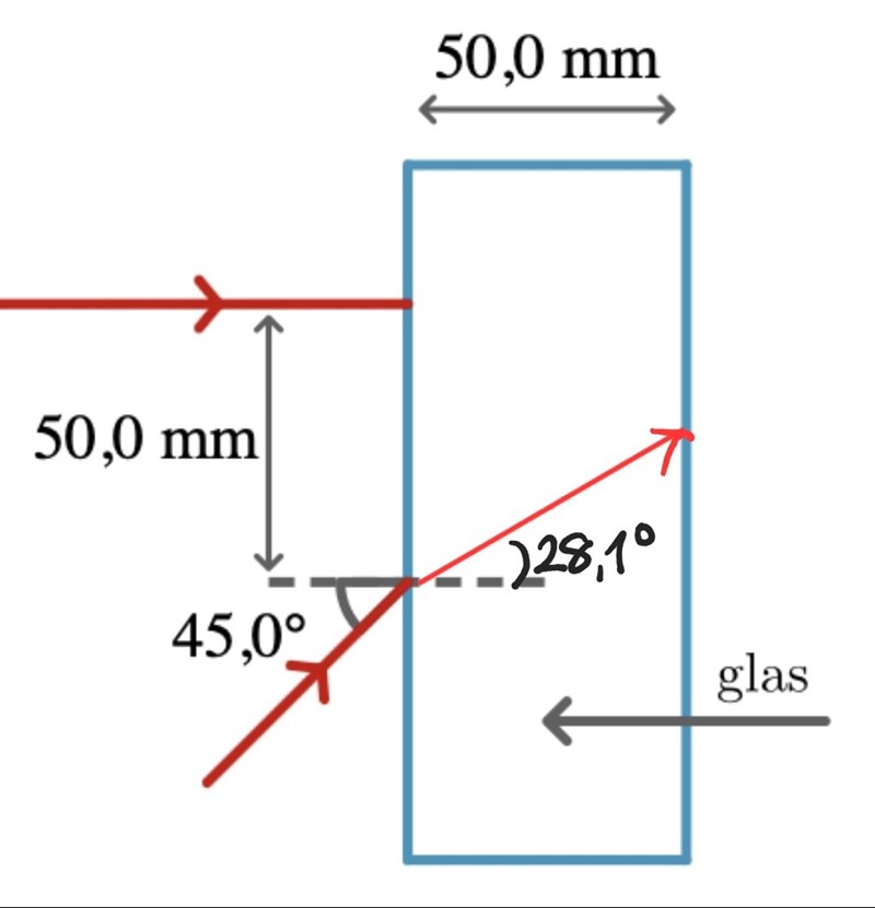 Uppgiften lyder: Två laserstrålar riktas mot en glasplatta enligt figuren nedan. Glasplattans brytningsindex är 1,50. Beräkna hur långt bakom glasplattan laserstrålarna kommer att mötas efter passagen av glaset.