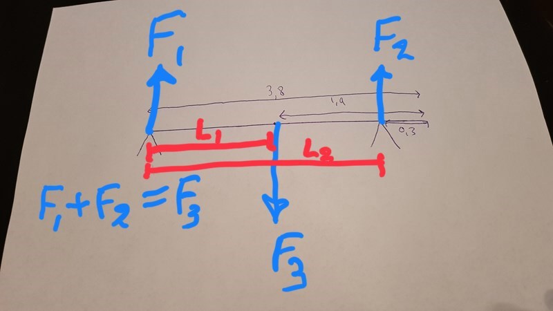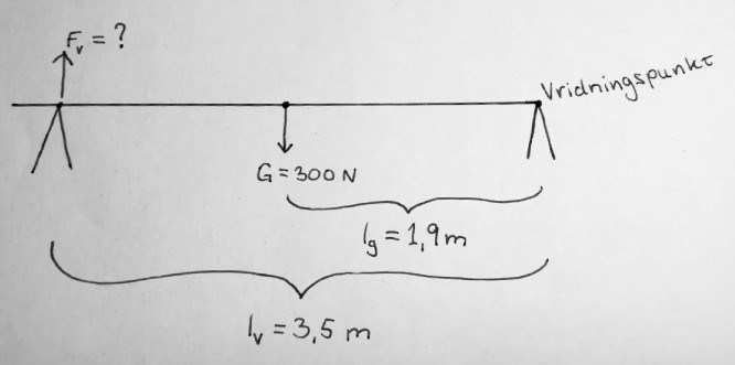 Kraften Fv vid den vänstra bocken gånger dess distans till vridningspunkten (lv=3,5 m) ska vara lika stor som kraften från plankan (G=300 N) gånger dess distans till vridningspunkten (lg=1,9 m).
