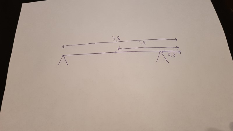 Mitt svar: Plankan 3,8 meter/2 för att få reda på mitten= 1,9. 1,9-0,3 till bocken sedan vet jag inte riktigt mer..
