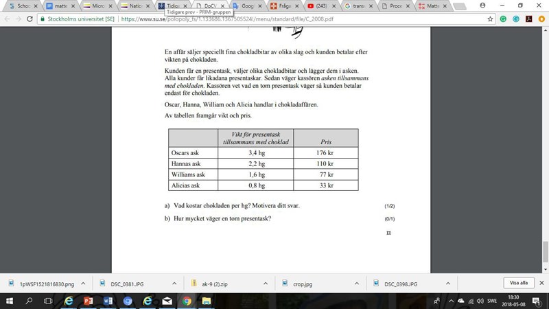 så 0,6 chok kostar 33 så enligt tabell vikten på chok+ask är 0,8 så vikten på chok 0,6 så ask 0,2hg