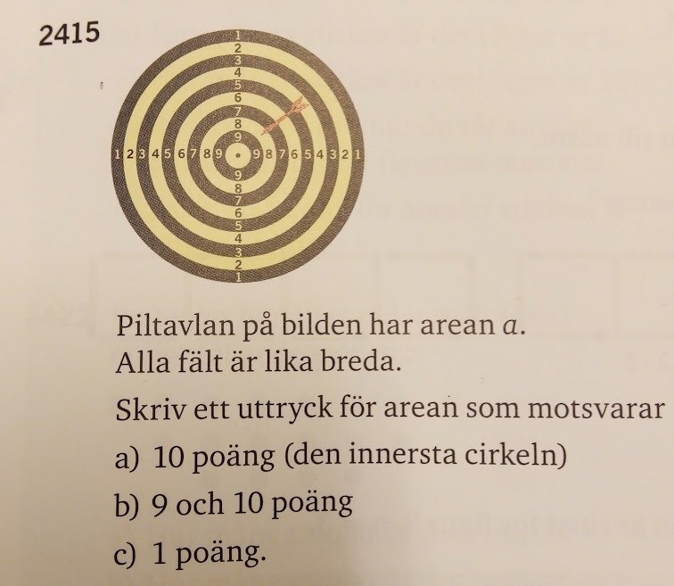 Lokapo skrev:angelkeyne skrev:Ture skrev:dom vill på a veta arean av den innersta gula cirkeln,