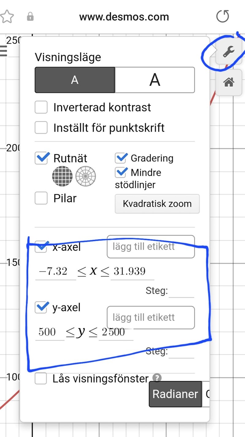 Tryck på skiftnyckeln och skriv in ungefär följande intervall på x och y.