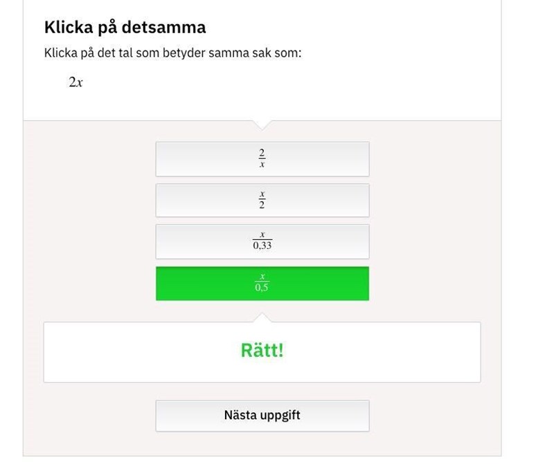 Om du har två päron (2x) och delar upp dem i en hög (2x/1) så är det två päron (2x) i varje hög.