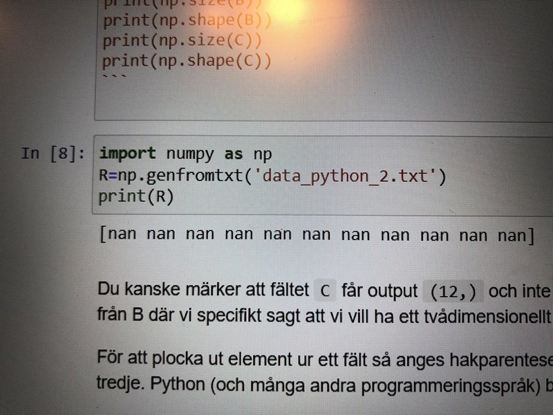 Funktionen letar efter tal i filen. Jag skulle gissa att när det står ”jag gillar glass” så försöker den tolka detta som tal, men de är ju inte det, så det blir kanske [nan, nan, nan] eller något liknande? Som sagt tidigare, nan betyder ”not a number”