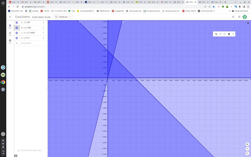 Jag la in villkoren x>4y och 25000>199x+1196y: