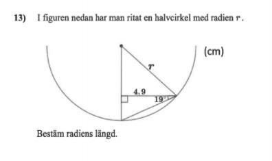 Jag har börjat med att skriva 180 grader eftersom det är triangelns vinkelsumma. Den mindre triangel tror jag att den är 90°+19°+71°=180 grader. linjerna som går ut från mittpunkten av cirkeln är lika långa och det är radien men vet inte hur jag ska komma fram till det. Tacksam för svar:)
