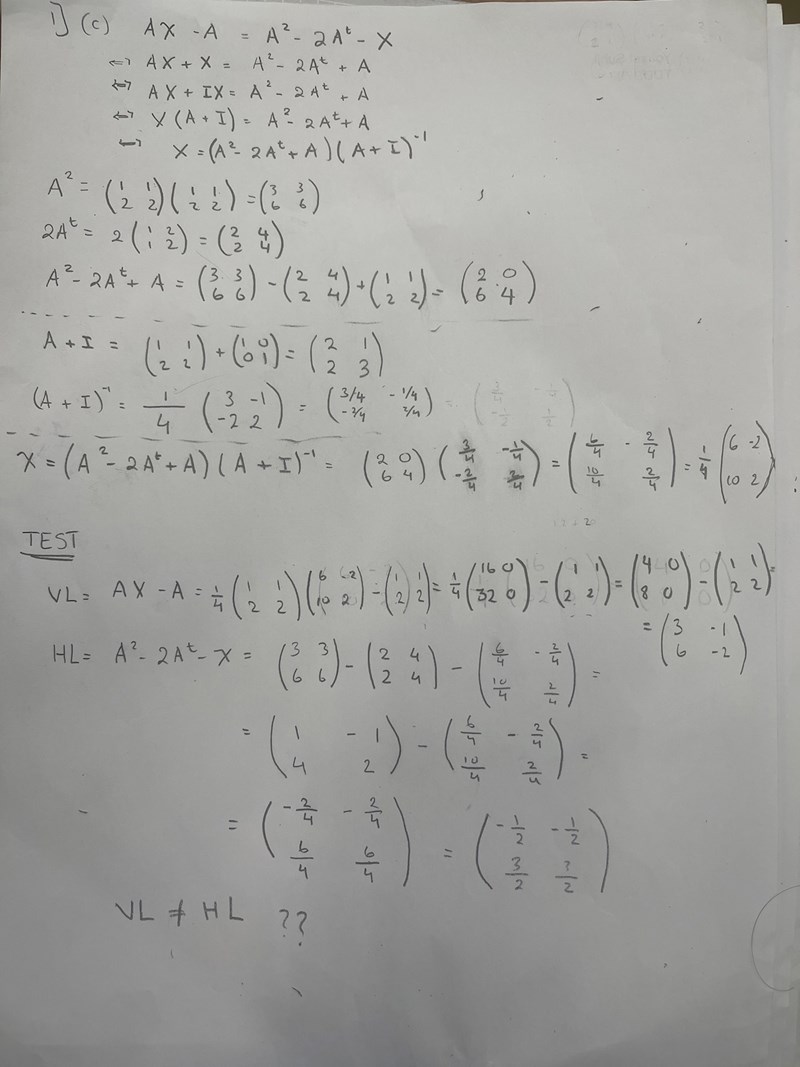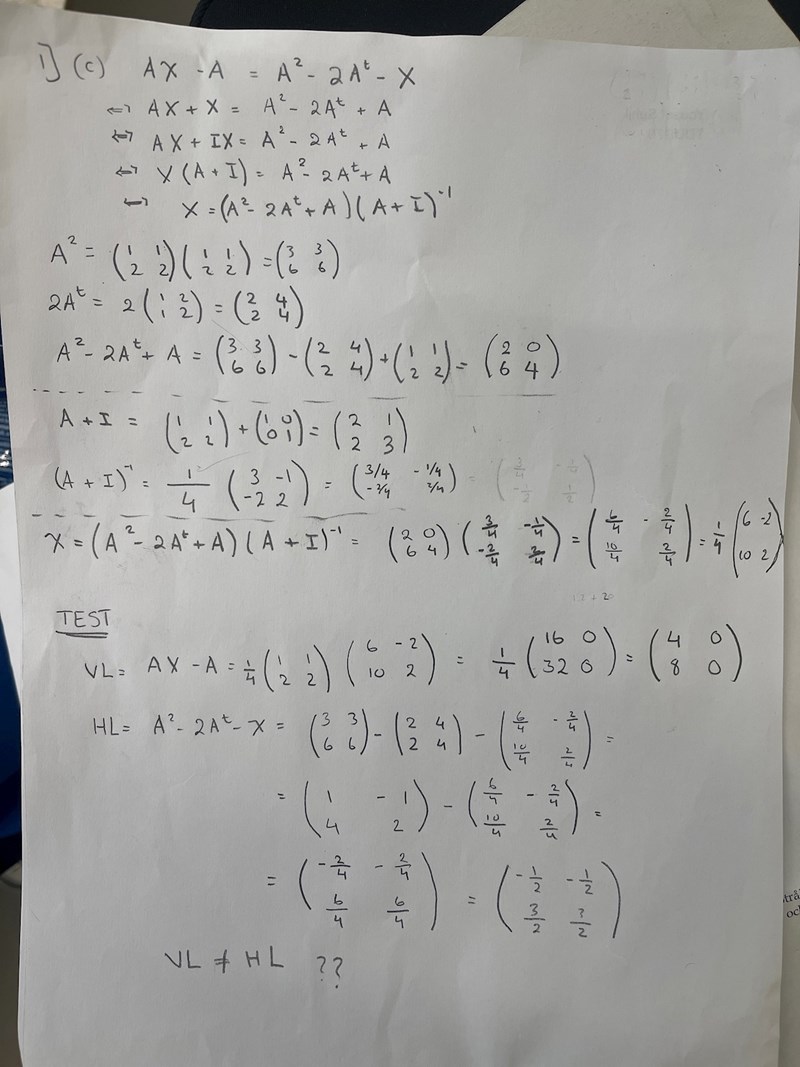 Jag har försökt lösa den här matrisekvationen men när jag testar svaret ser det ut att vara fel
