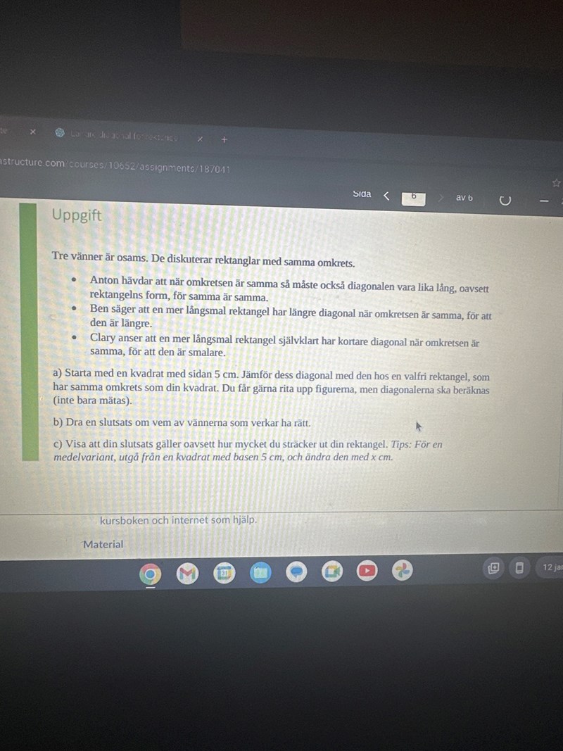 Starta med en kvadrat med sidan 5 cm. Jämför dess diagonal med den hos en valfri rektangel, som har samma omkrets som din kvadrat.
