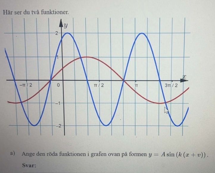 Periodiciteten för röda kurvan ser ut att vara 2 π.  Alltså bör k = 1.