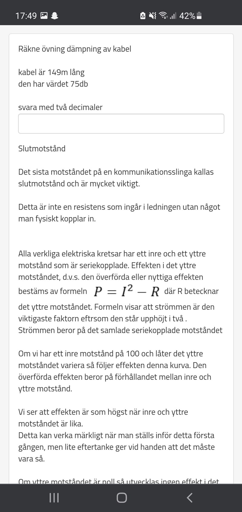 Jag har nu provat räkna fram vet inte om jag räknat rätt men jag har 149 dela på 7.5 då har jag fått svaret i två decimaler 19.8. Men vet inte om jag räknat rätt för det står kabeln är 149m lång och den har värdet på 75db (7.5m) då har jag tagit 149 delat på 7.5 och fått svaret 19.8 då vill jag veta om behöver hjälp har jag räknat rätt
