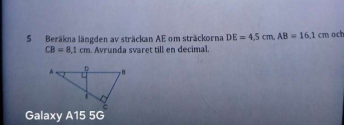 Du ska nog utnyttja att trianglarna ADE och ABC är likformiga eftersom båda har en rät vinkel och vinkeln A är gemensam. Det betyder att