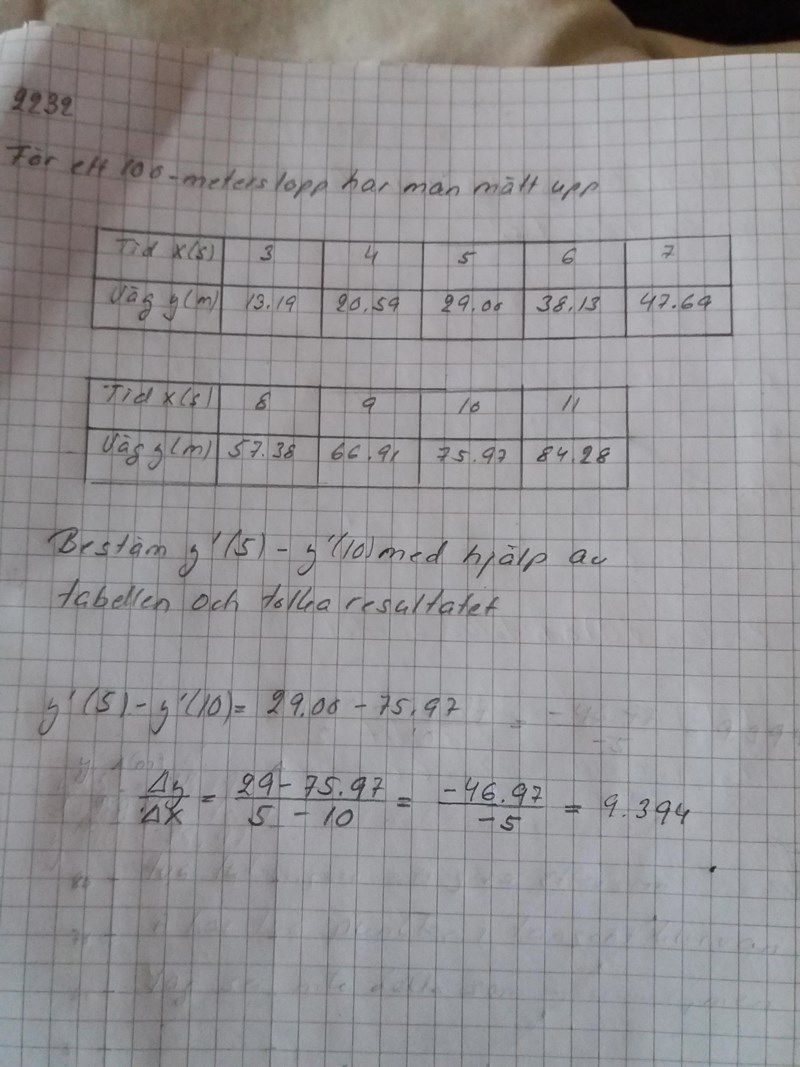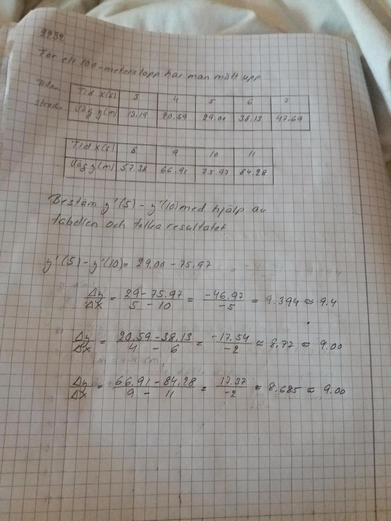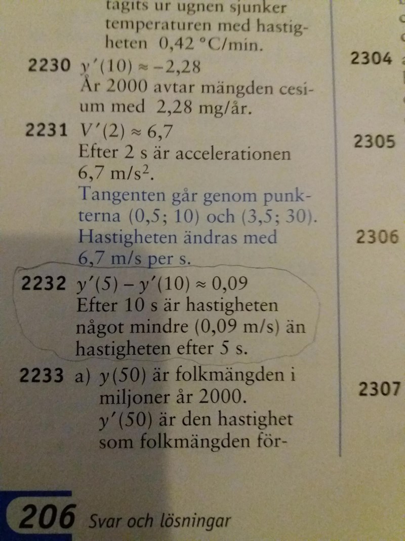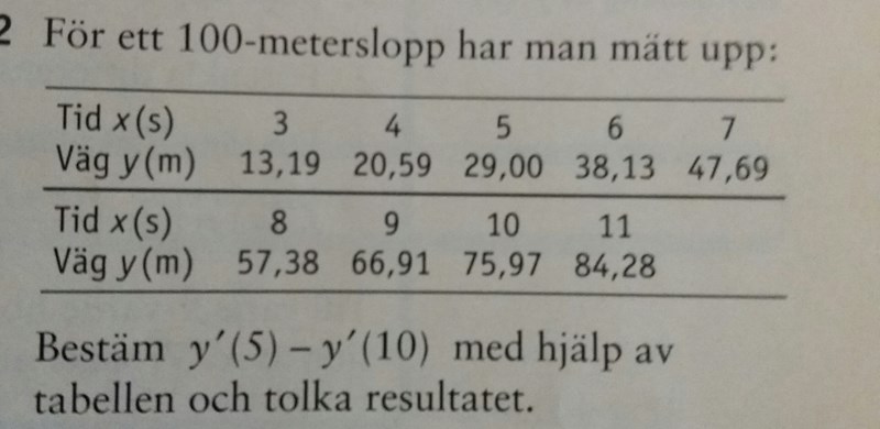 Ja, de har säkert räknat ut f'(5) och f'(10) på det sätt jag har beskrivit (0ch du har gjort också). Det du har räknat ut på telefonen är inte f'(5) - f'(10) utan (f(5)-f(10))/5, d v s medelhastigheten i intervallet mellan 5 och 10 sekunder.