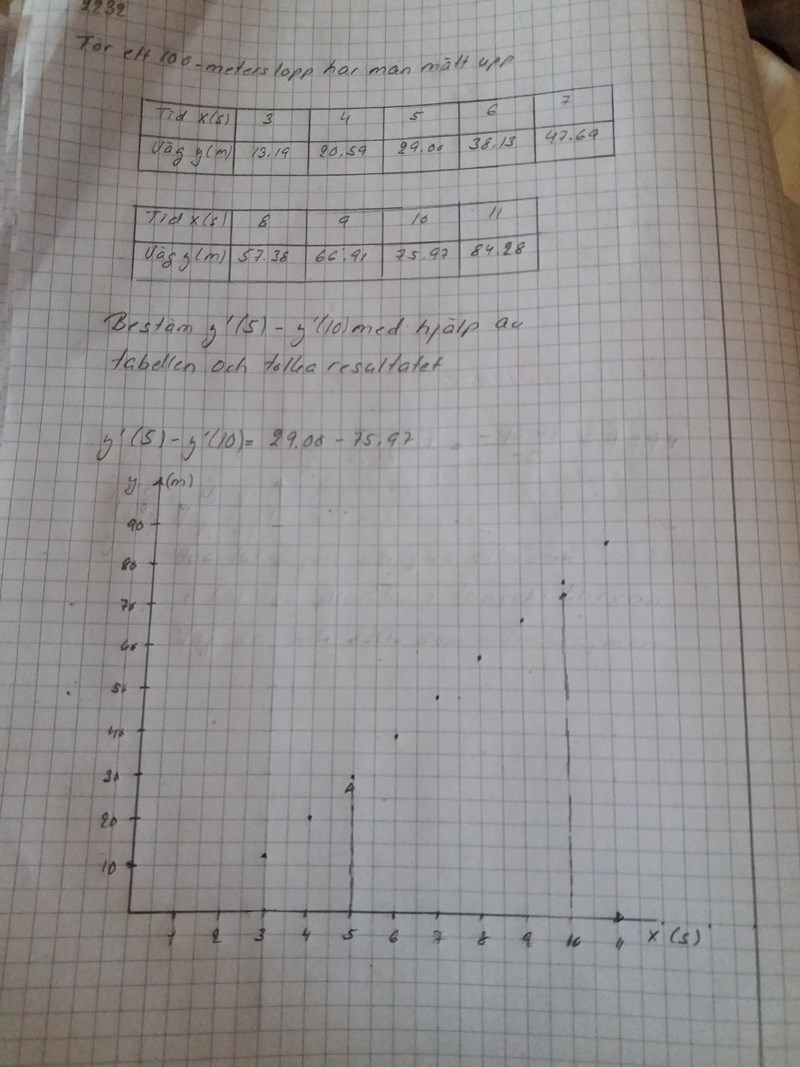 Vad gör du på första raden med ? Du har ett värdepar för x = 5 och ett för x = 10, d v s du beräknar medelhastigheten för x = 7,5. Det är inte det man frågar efter.