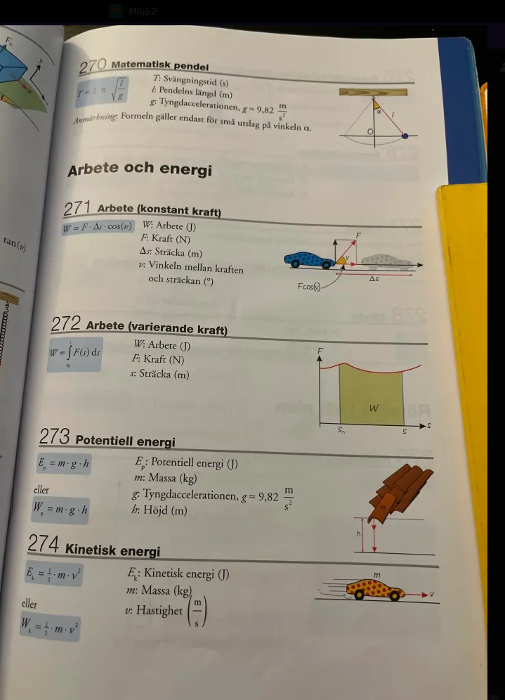 Jag har också Ek kinetisk energi, potentiell energi. W= F *sträcka * cos v