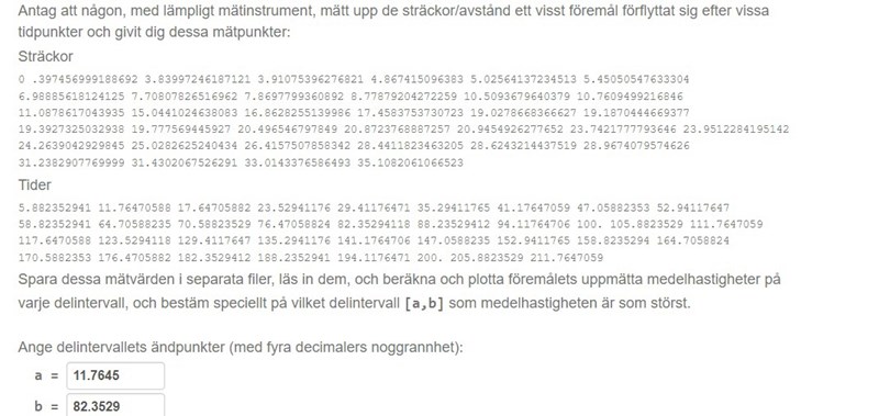 En annan tolkning är att man ska hitta det tidsintervall för vilket sträckan delat med tiden , dvs medelhastigheten, är som störst. Övningen är då att konstruera en loop som räknar upp alla tänkbara delintervall.