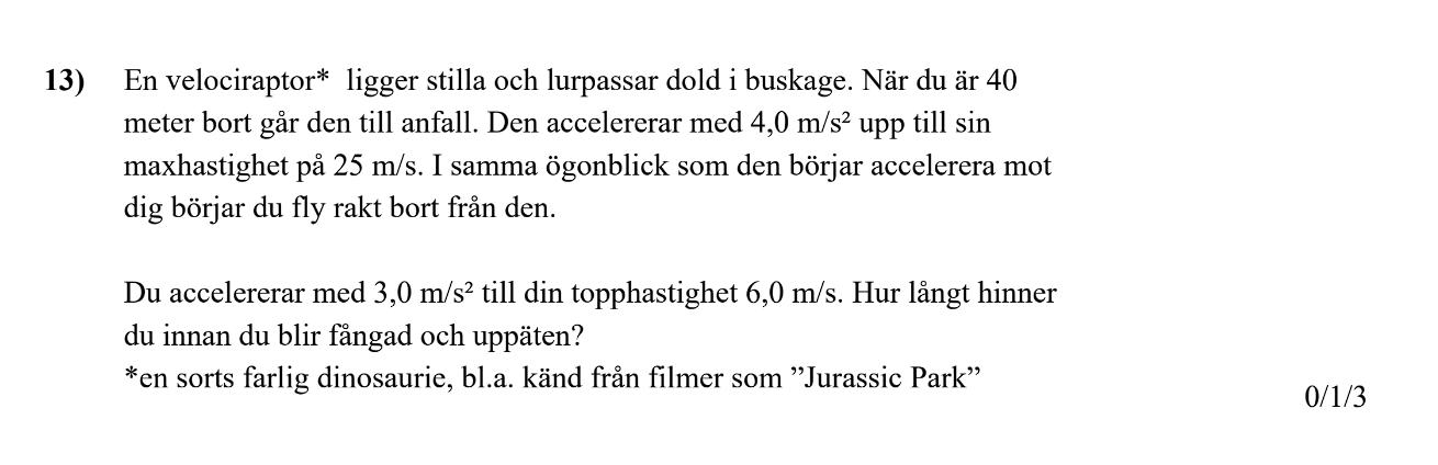 Veliciraptorn hinner på två sekunder 8 meter, och får en hastighet på 8m/s vid den punkten jag kommer upp i en konstant hastighet. Och eftersom den totala sträckan i början var 40 meter i mellan oss så är sträckan i mellan oss i den tidpunkten min hastighet blir konstant, 40+(6-8) där 6 är så långt jag springer innan jag kommer upp i konstant hastighet, och 8 är hur långt velociraptorn har kommit vid samma tidpunkt. Sträckan i mellan oss är då 38 meter.