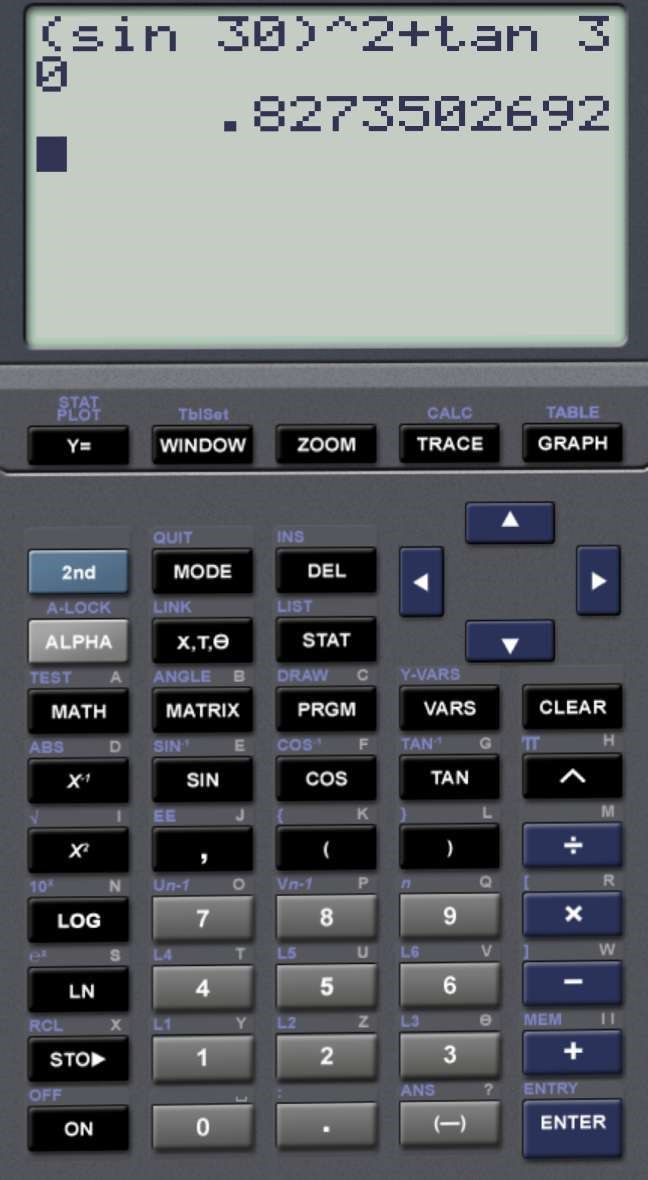 "(" + "SIN" + "3" + "0" + ")" + "^" + "2" + "+" + "TAN" + "3" + "0" + "ENTER" ~0.82735