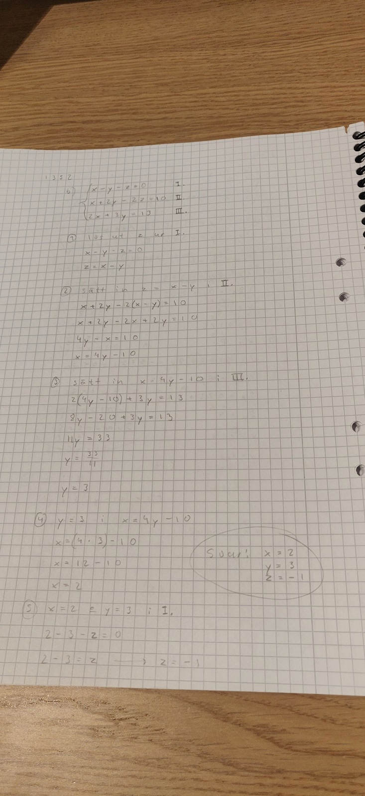Garonen skrev:Börjar med att få x uttryckt med z och x ur första ekvationen. Sedan bildar jag ett nytt ekvationssystem med endast variablerna y och z. Kommer denna metod fungera?
