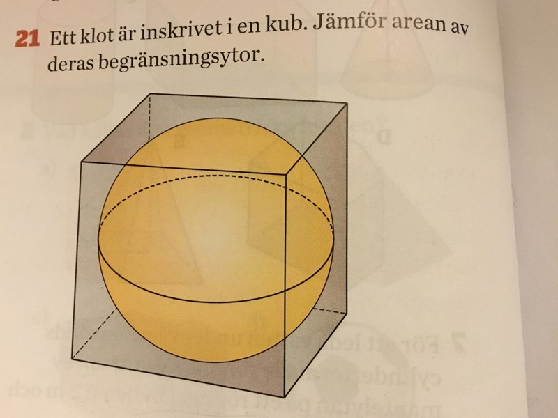 Vad blir då, uttryckt i , kubens begränsningsarea i relation till klotets?