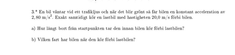 Jag tror att jag ska använda formeln s=vot+ för att räkna ut sträckan när bilen hinner fram till lastbilen, kan det vara rätt och hur jämför jag det med lastbilens medelhastighet 20 m/s?
