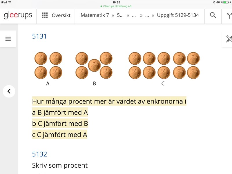 b) C jämfört med B det är alltså med B man ska jämföra med, dvs B = 5 kr är 100%