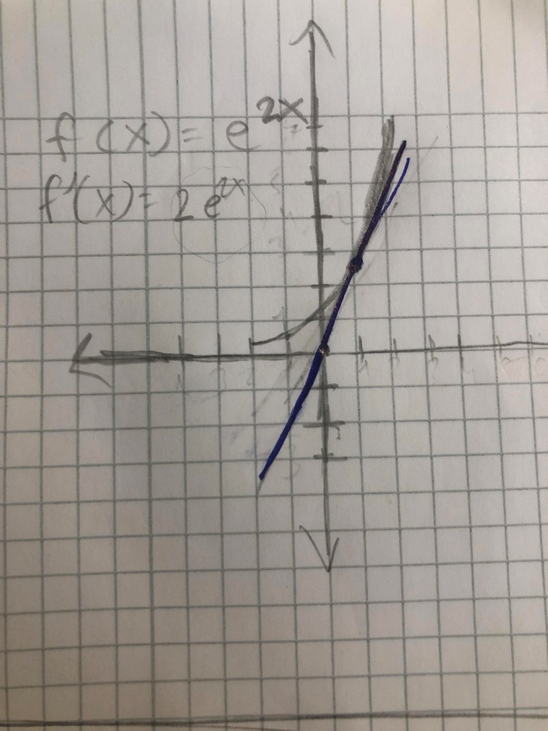 Varför skulle det vara fel att använda samma metod för den övre uppgiften? Dvs att man deriverar funktionen f’(x)=e^2x -> 2e^2x