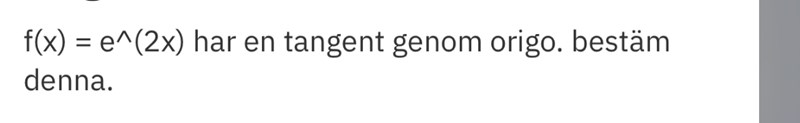 Bilden för funktionen f(x)=e^2x . Vi vet att tangenten går igenom origo men vi känner inte till tangeringspunkten