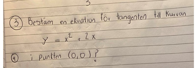 Laguna skrev:Om du deriverar och sätter in x = 0 i den första uppgiften så får du kurvans lutning när x = 0. Men tangenten nuddar inte kurvan i x = 0 utan någon annanstans, vilket betyder att kurvans lutning i x = 0 är ointressant.
