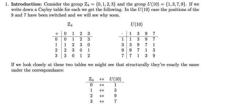 De har nog bytt plats på 7 och 9 för att det ska bli lättare att se mönstret. Om vi jämför elementen som står på samma plats i respektive tabell, får vi att noll i Z4 motsvarar ett i U(10), eftersom det på alla ställen i U(10):s tabell står en etta där det står noll i Z4. Undersök hur det ser ut för ett, två och tre i Z4. Motsvarar de någon siffra i U(10)? :)