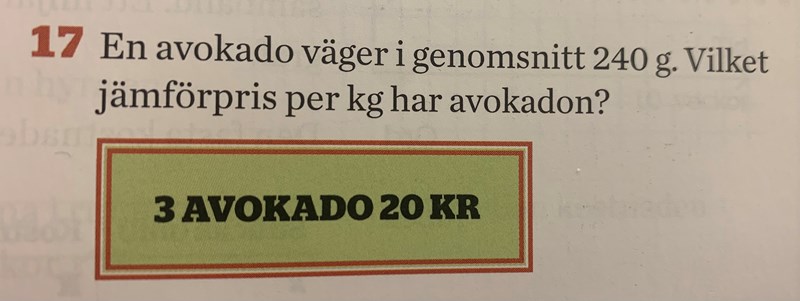 Smaragdalena skrev:Jämförpris är kr/kg. Du behöver alltså veta priset i kronor (det stå redan i uppgiften) och massan i kg (det kan du räkna ut). Kommer du vidare?