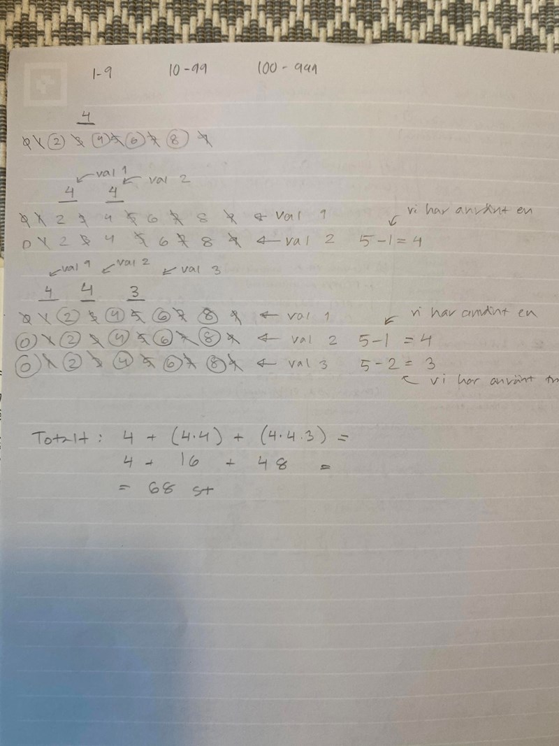 Om vi sedan går till hundratalen så är den enda begränsningen att vi inte får ta samma tal som det vi redan valt i entalet. Detta gör att vi kan välja alla utom ett, vilket ger 10-1= 9 val.