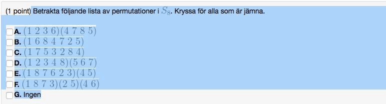 Så svar: (1 2) (2 3) (6 4) (7 8) ( 8 5) är då A.s transpoisitoner. Där har alla "en kompis" så jag tänker, innebär det då att den går jämt ut,