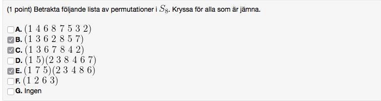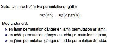 mrlill_ludde skrev:Laguna skrev:Hur ser definitionen ut på jämn/udda permutation? Du ska nog titta på antalet transpositioner, som det står under Def, och inte cyklernas längd.