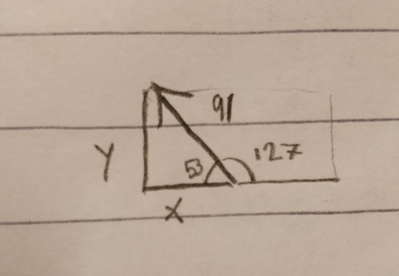 Hej igen! Jag löste uppgiften genom att använda vinkeln 53 pga att jag enkelt såg en rätvinklig triangel som på bilden. Jag förstår att vinkeln för 127 och 53 är samma sak men jag behöver alltid se den räta vinkeln framför mig för att använda cos och sin.