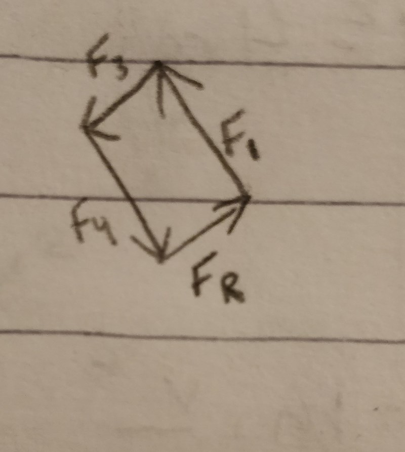 Jag ritade de tre krafterna och sedan la jag ihop de och fick den resulterande kraften FR. Hur ska jag nu veta FR:s egenskaper, riktning och storlek?