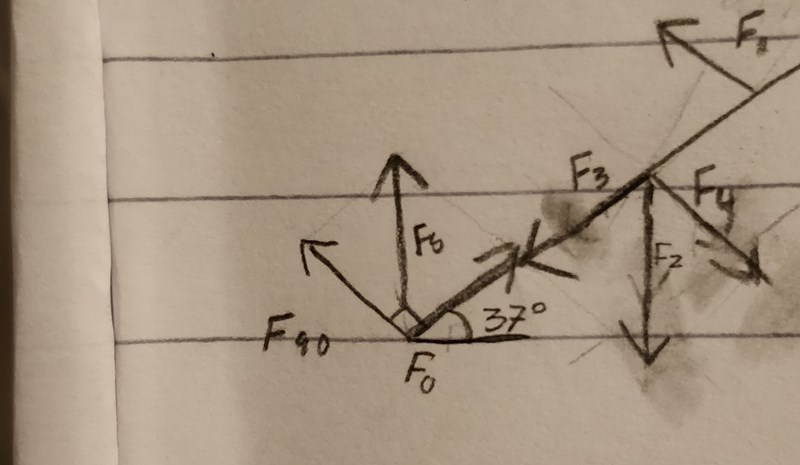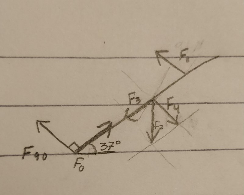 Om F90 och F0 är komposanterna så blir kraften riktad rätt uppåt 53 grader från stegen, vilket är fel svar.