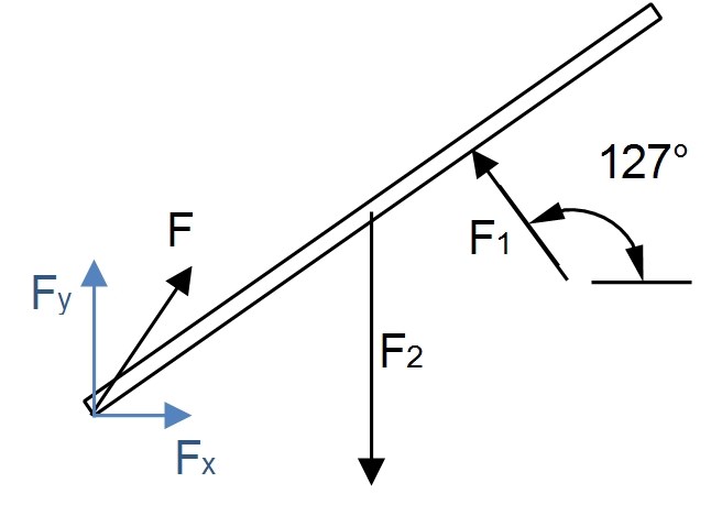Fx+F1cos(127°)=0  Fy-F2+F1sin(127°)=0 \begin{matrix}\rightarrow &\quad F_x+F_1\cos(127^{\circ})&=&0 \\ \uparrow & \quad F_y-F_2+F_1\sin(127^{\circ})&=&0\end{matrix}
