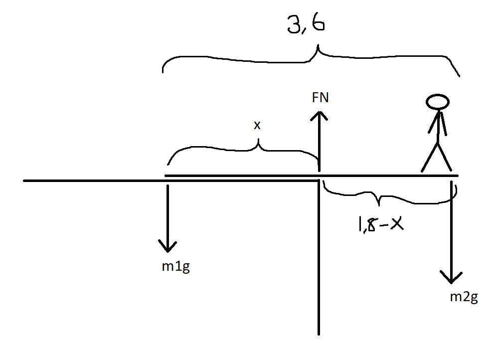 En person ställer upp ett bord med en tung planka på. Sedan ställer han sig längst ut på plankan. Personen väger 76kg, plankan är 3,6m lång och väger 22kg.