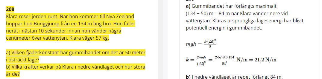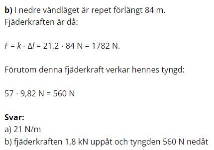 annars förstår jag inte riktigt sammanhanget av uppgiften. För den startar ju på en höjd som ger repet en potentiell energi ovanför jämviktsläget. och elongationen är ju skillnaden mellan jämviktsläget och elongationen. Hur ska jag annars räkna ut b uppgiften? För jag förstår det som de har skrivit i facit men förstår inte hu de bara i b-uppgiften kan sätta elongationen (förändringen i l) som 84 N