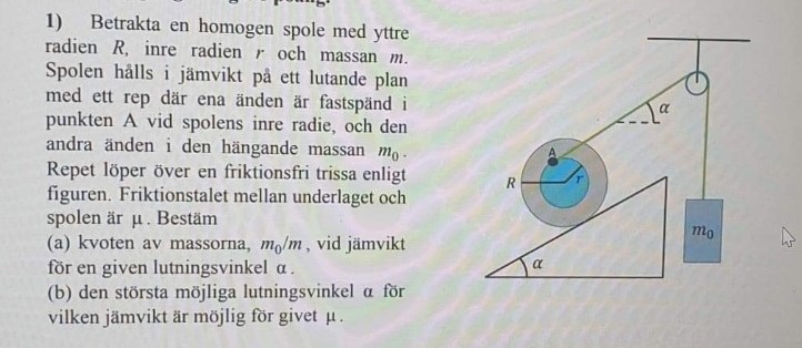 Jag kan försöka iallafall. Vid jämvikt gäller att kraftsumman i planets riktning är noll. Dessutom att vridmomentsumman kring centrumaxel av spolen är noll. Jag skulle börja med att teckna dessa villkor för att se om det ger något intressant.