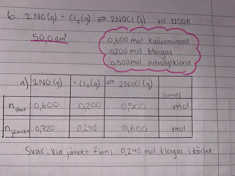 I ett kärl med volymen 50,0 dm3 införs 0,600 mol kvävemonoxid, 0,200 mol klorgas och 0,500 mol nitrosylklorid, NOCl.