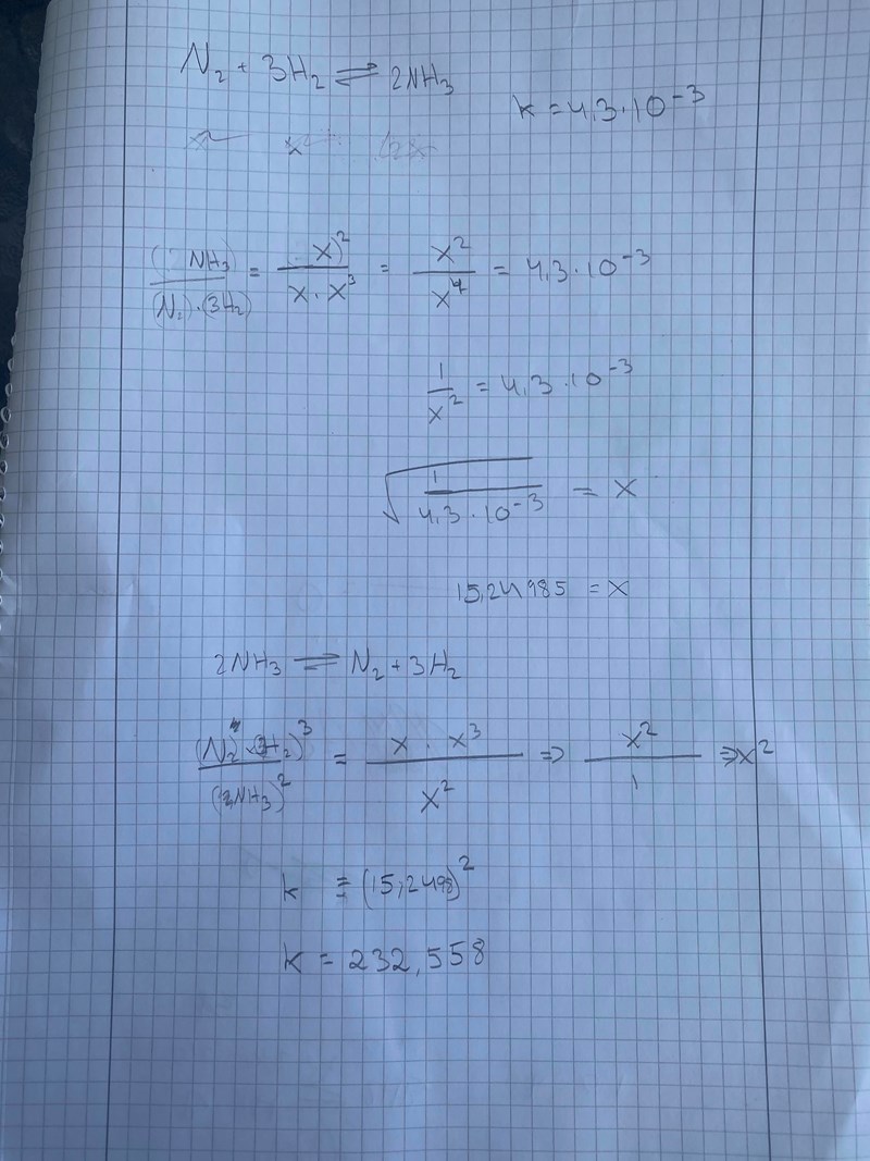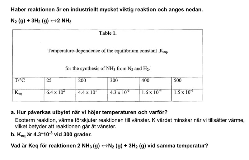 N2 (g) + 3H2 (g) ↔2 NH3. Keq är 4.3*10-3 vid 300 grader.